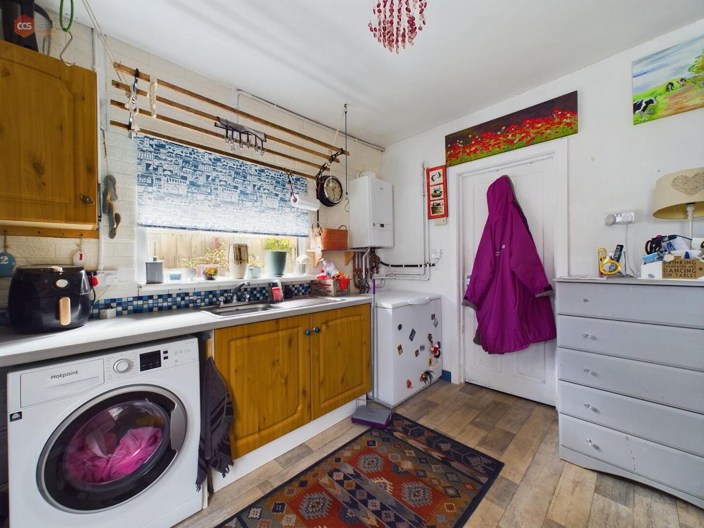 - Vinyl floor, white low level base units, single bowl stainless steel sink unit, white UPVC window.